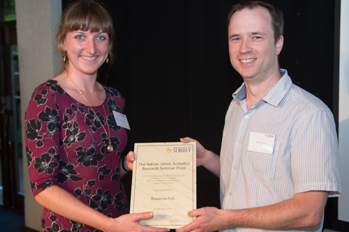 The Adrian James Acoustics Prize for the most outstanding audio research seminar paper, was presented to Rosanna Fish by Andy Thompson from Adrian James Acoustics.