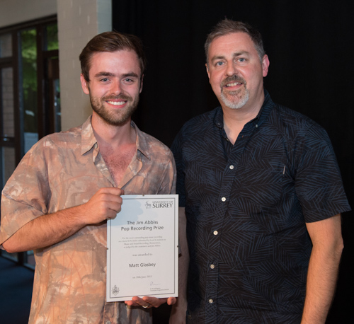 The Jim Abbiss Pop Recording Prize for the most outstanding pop recording, as judged by Jim himself, was presented to Matthew Glasbey by Jim Abbiss.