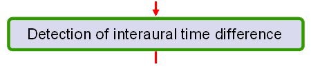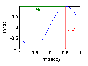The interaural time difference (ITD) is detected using the cross-correlation calculation. The correlation is calculated between the left and right channels for a range of time offsets (τ) of ±1ms (large enough to take into incorporate the full range of naturally occuring ITD values). The value of τ that relates to the peak in the measured cross-correlation is a prediction of the interaural time difference of the signal. An example measurement result is shown below.