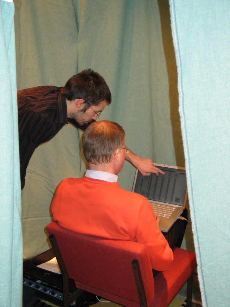 In addition to the seminar debates, the group always take the opportunity to carry out their own aural assessments on the tests that are being conducted within the project. Here you see Soren Bech undergoing instruction on how the interface for the indirect envelopment tests should be operated. |