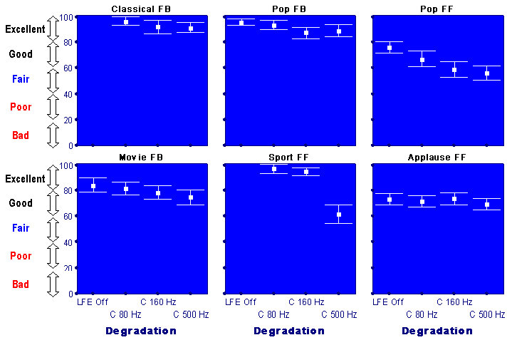 Figure 2 shows the effect of switching off the LFE channel in conjunction with high-pass filtration of all channels. Effects of switching off the LFE channel without any filtration of the main channels are also presented in this figure in order to compare the magnitude of the effect for these two types of degradation. Switching off the LFE channel combined with high-pass filtration of the main channels degraded the audio quality considerably. For all items shift of the lower boundary of the bandwidth up to 500 Hz and switching off the LFE channel degraded the audio quality to "Poor" (20-40). Obtained results show that simultaneous reduction of low frequencies in all channels considerably degrades audio quality. A similar result was obtained for the front left and right channels (Fig. 3). High-pass filtration of front left and right channels in conjunction with switching off the LFE channels caused also substantial degradation of audio quality, however a bit smaller than in the previous case. Moreover, for some items (Pop F-F and Applause F-F) band-limitation of left and right channels caused small deterioration of quality in relation to degradation of quality due to switching off the LFE channel. It can be explained by the fact that loss of LF content in left and right channels was not so noticeable because of the pronounced LF components in remaining channels.