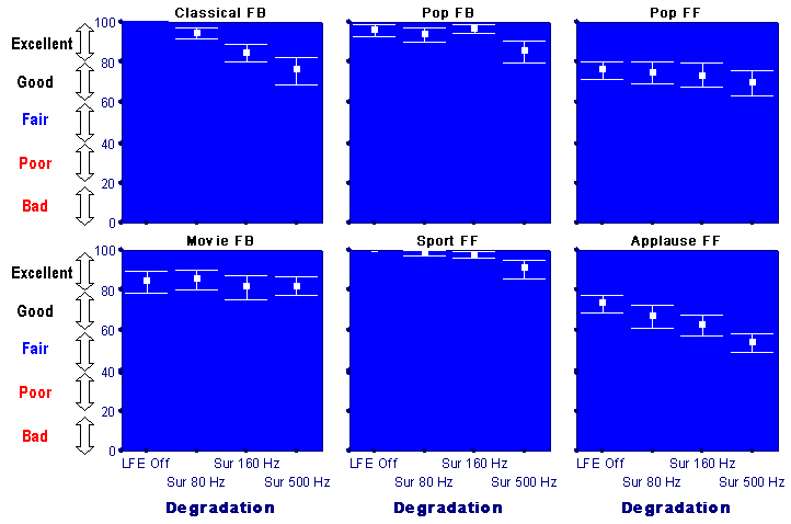 High-pass filtration of rear channels had only a small effect on degradation of audio quality for most items (except of classical music). The degree of deterioration of quality due to switching off the LFE channel with simultaneous high-pass filtration of rear channels was only slightly greater than the degree of deterioration of quality caused by only switching off the LFE channel (Pop F-B, Pop F-F, Movie F-B, Applause F-F). For organ music (Classical F-B) and sport item (Sport F-F) limitation of LF content of rear channels up to 80 Hz caused negligible degradation of quality. For organ music the loss of LF content was difficult to notice (probably due to masking effect) because of the pronounced bass in remaining channels. The lack of differences in quality for sport item was caused by the spectral characteristic of this item in which there was no perceivable LF content below 80 Hz.